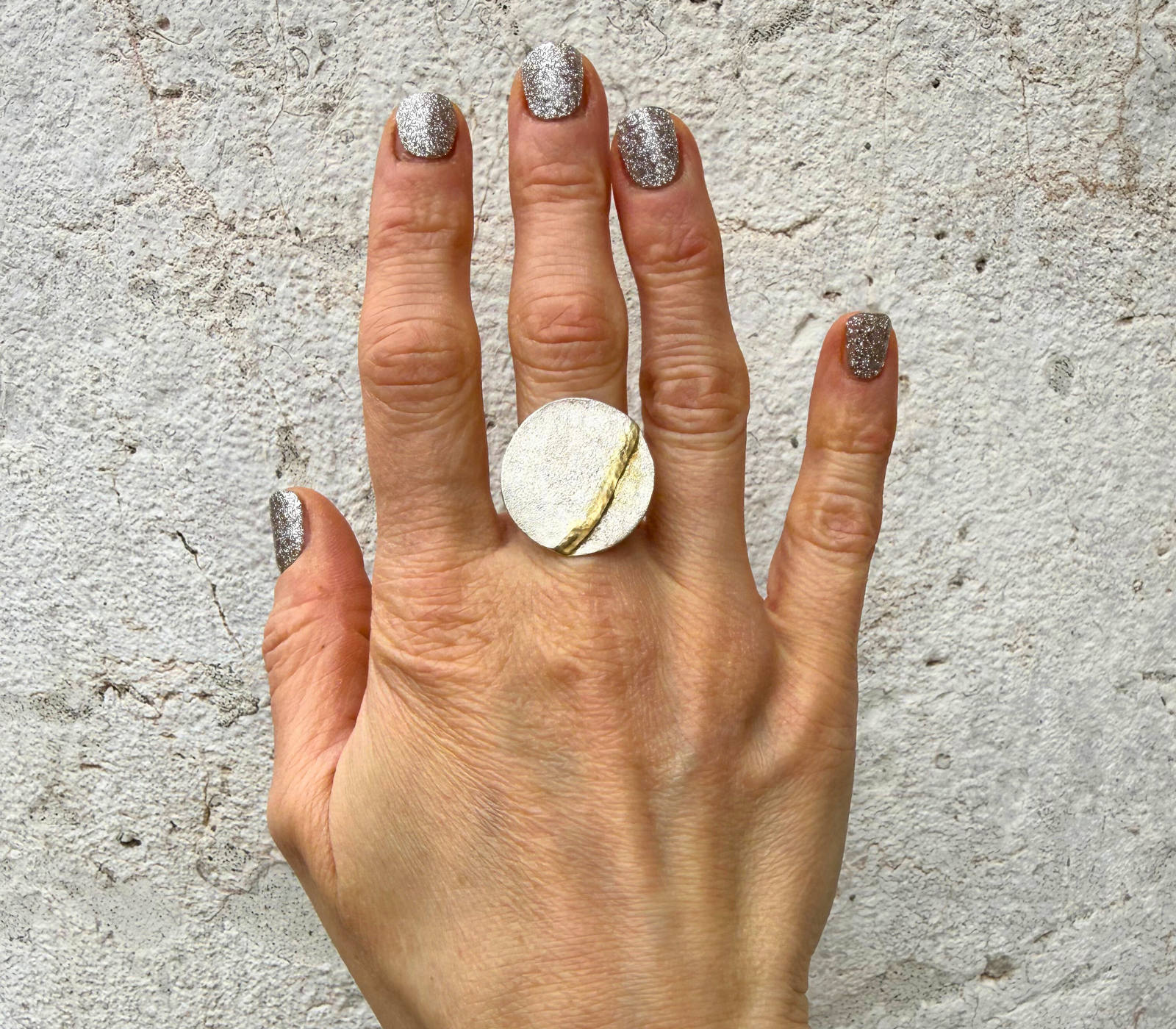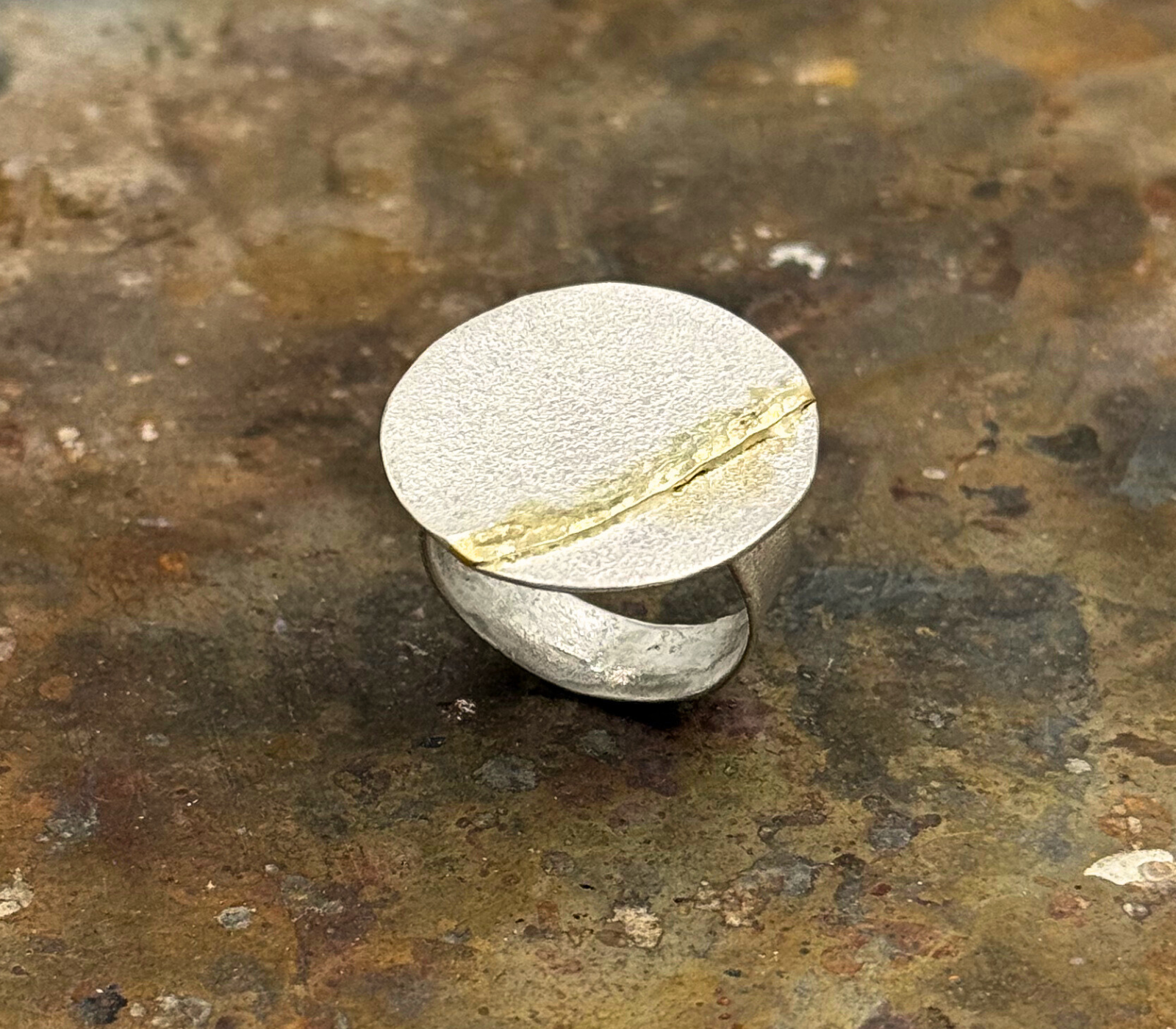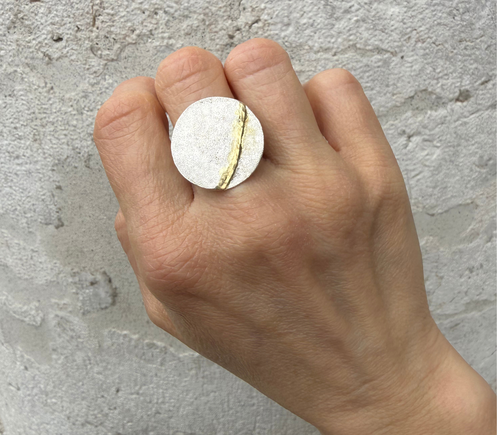 Questo anello in argento 925 e oro 750 è ispirati a Kintsugi: l’antica tecnica giapponese che valorizza le crepe e le fratture degli oggetti in ceramica riparandole con lacca urushi e polvere d'oro.