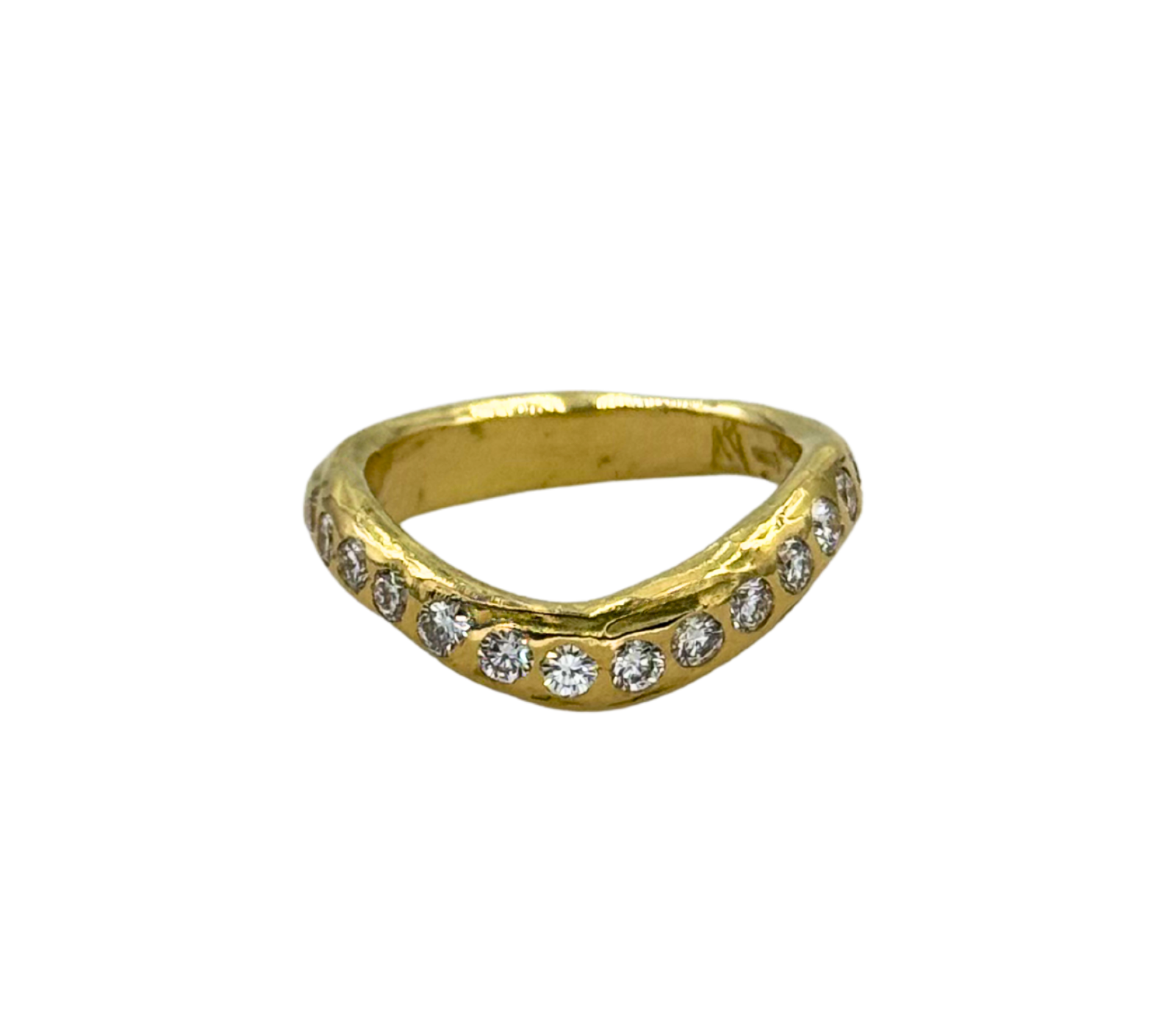 Anello in oro 750 lavorato interamente a mano secondo l'antica tecnica della cera persa, diamanti incastonati tramite la tecnica cosiddetta "a notte" senza griffe e quindi particolarmente piacevoli da indossare.