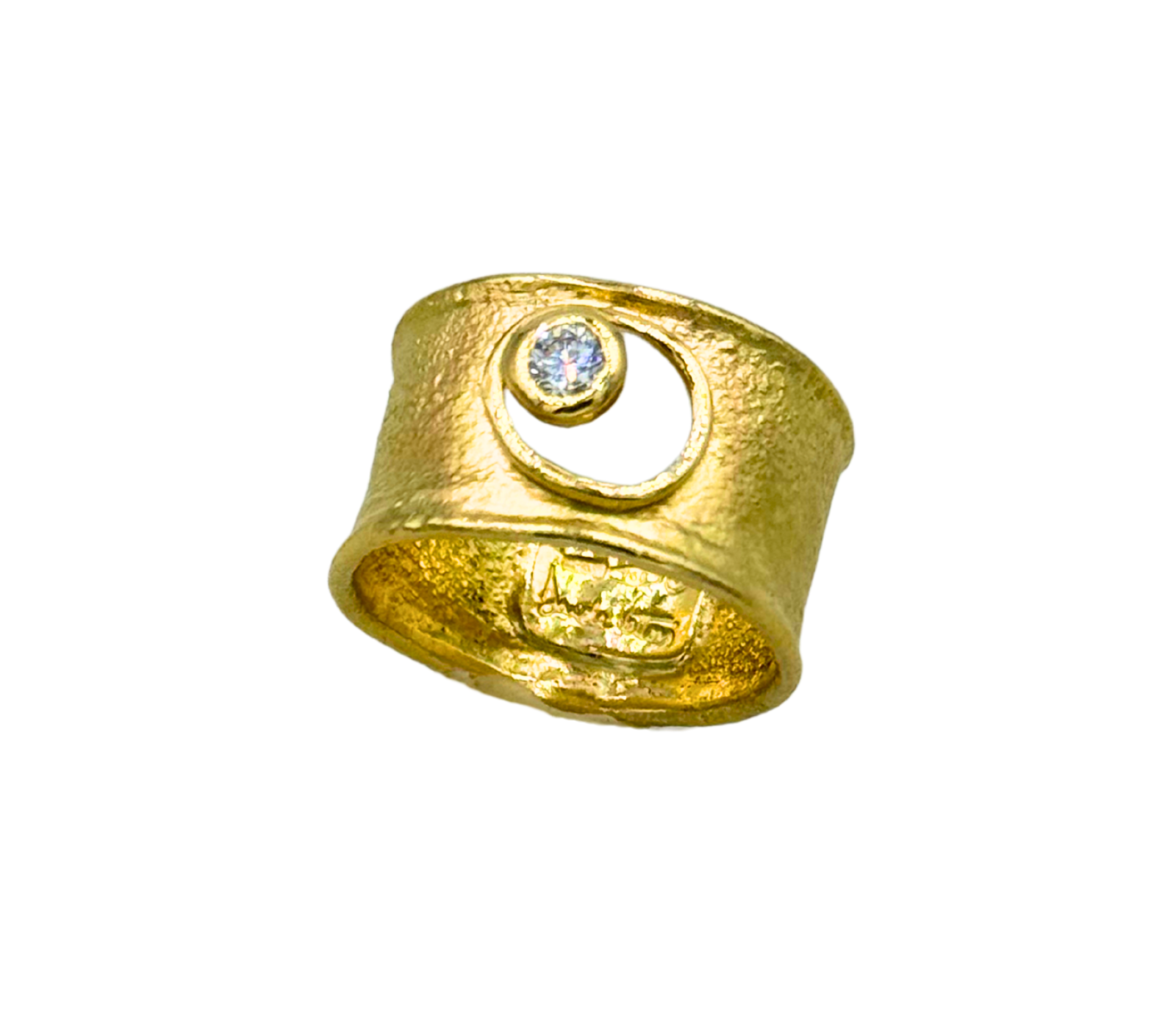 L'anello in oro 750 è lavorato interamente a mano a fuoco e martello nel nostro laboratorio di Vicenza, il diamante ha una caratura di 0,15 ct, il suo colore è G e la qualità VVS.