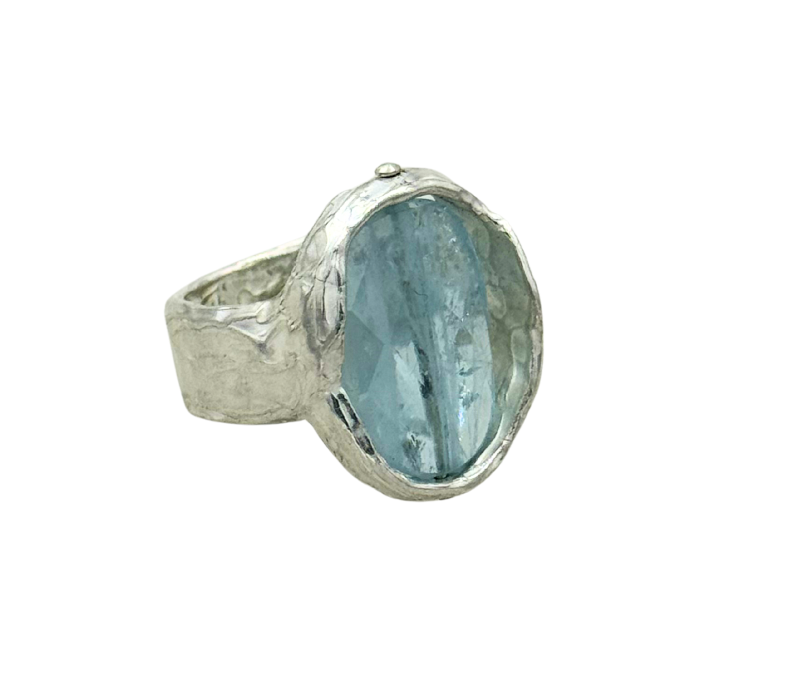Anello in argento 925 lavorato interamente a mano a cera persa nel nostro laboratorio di Vicenza. Al centro abbiamo impernato un'acquamarina naturale ovale.