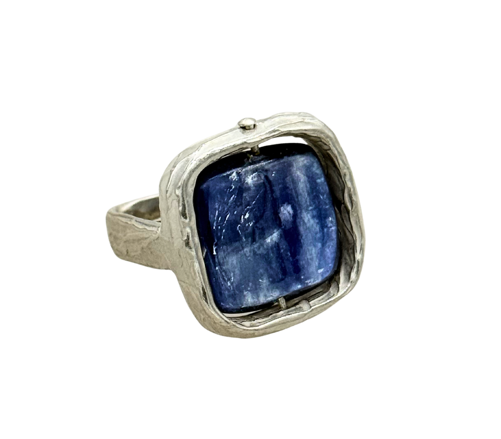 Anello in argento 925 lavorato interamente a mano a cera persa nel nostro laboratorio di Vicenza. Al centro abbiamo impernato una Kyanite quadrata.
