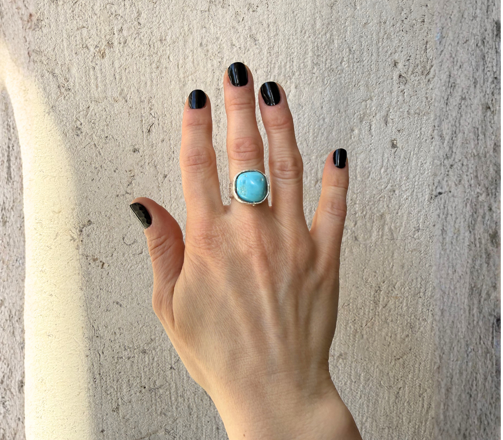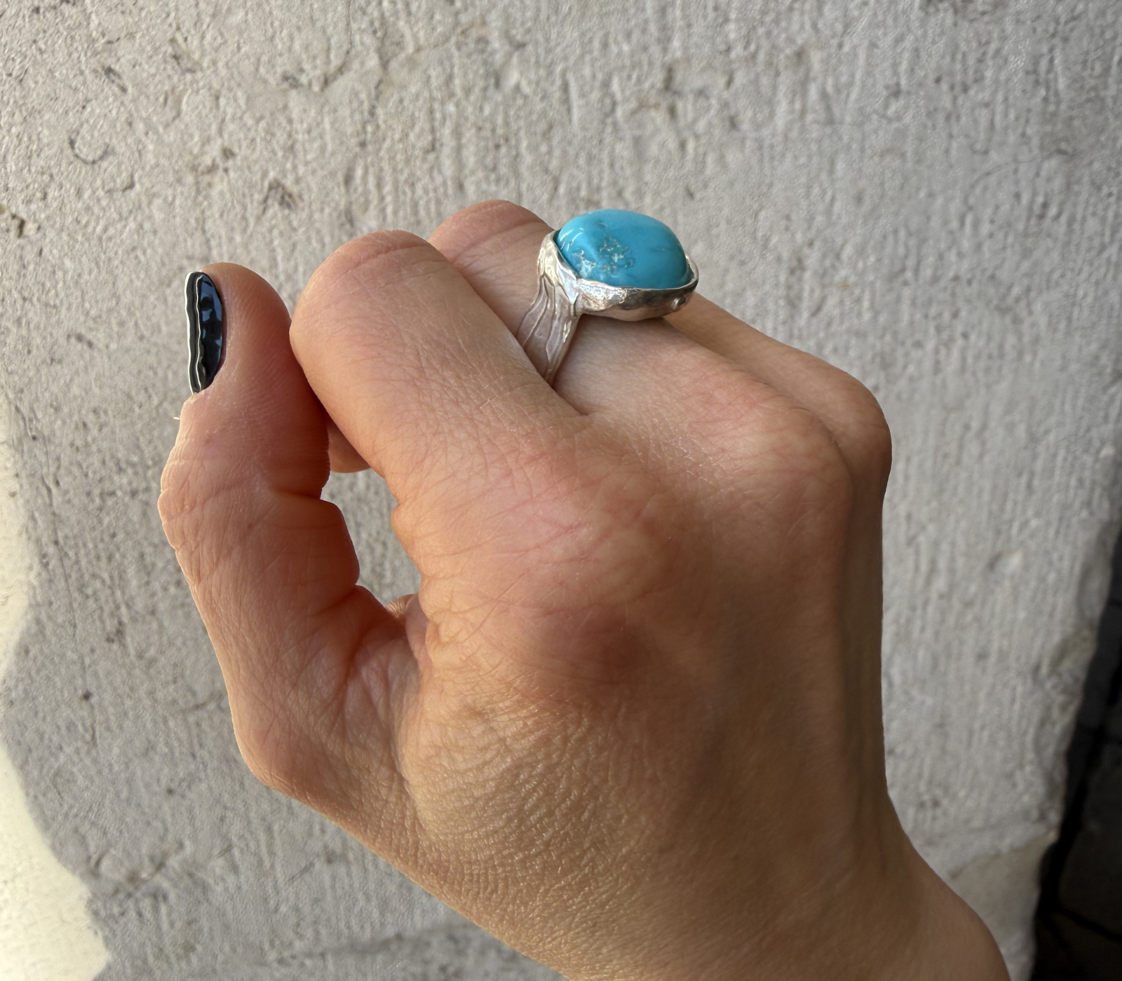Anello in argento 925 lavorato interamente a mano a cera persa nel nostro laboratorio di Vicenza. Al centro abbiamo impernato un turchese naturale.