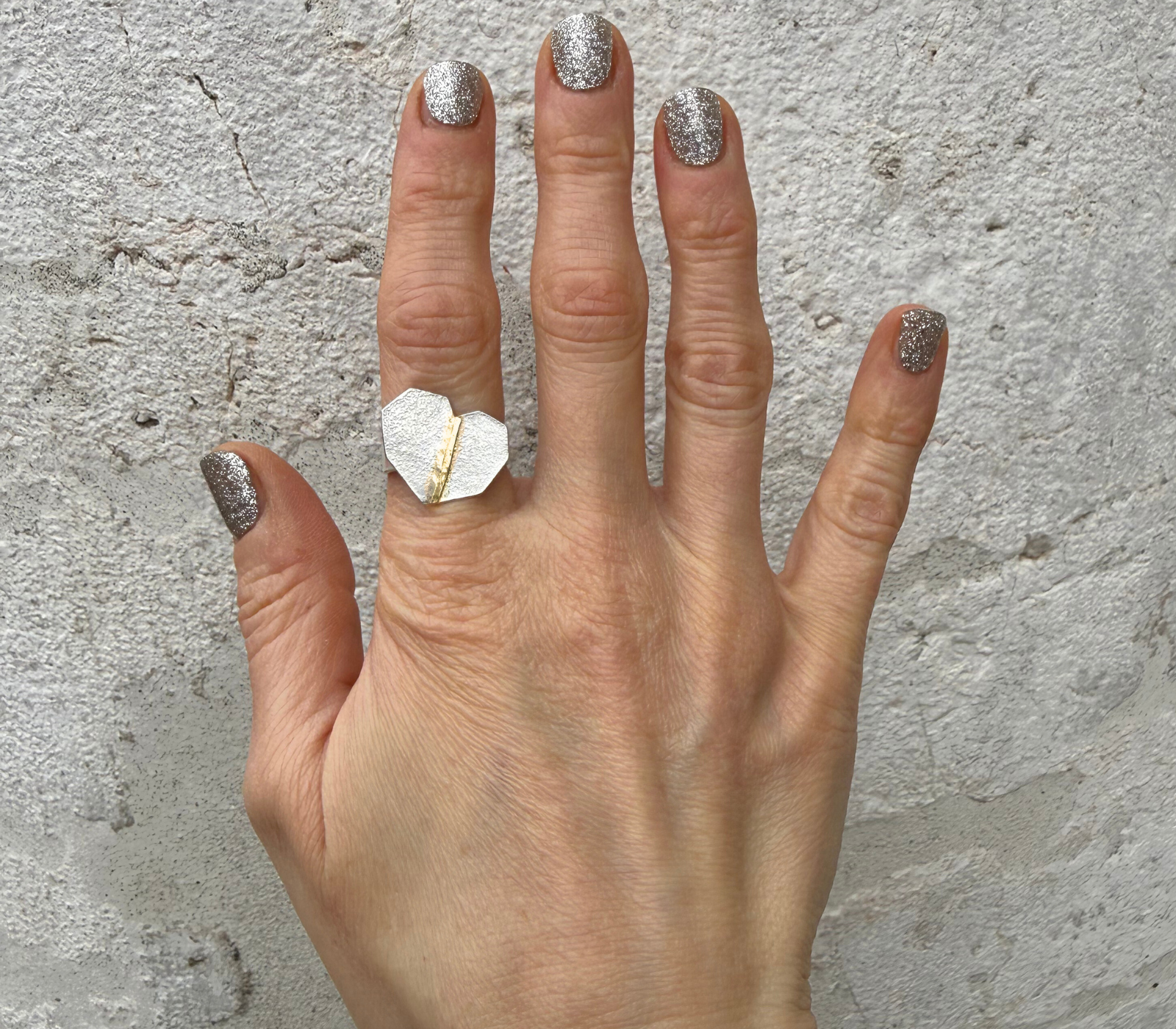 Questo anello in argento 925 e oro 750 è ispirato a Kintsugi: l’antica tecnica giapponese che valorizza le crepe e le fratture degli oggetti in ceramica riparandole con lacca urushi e polvere d'oro.