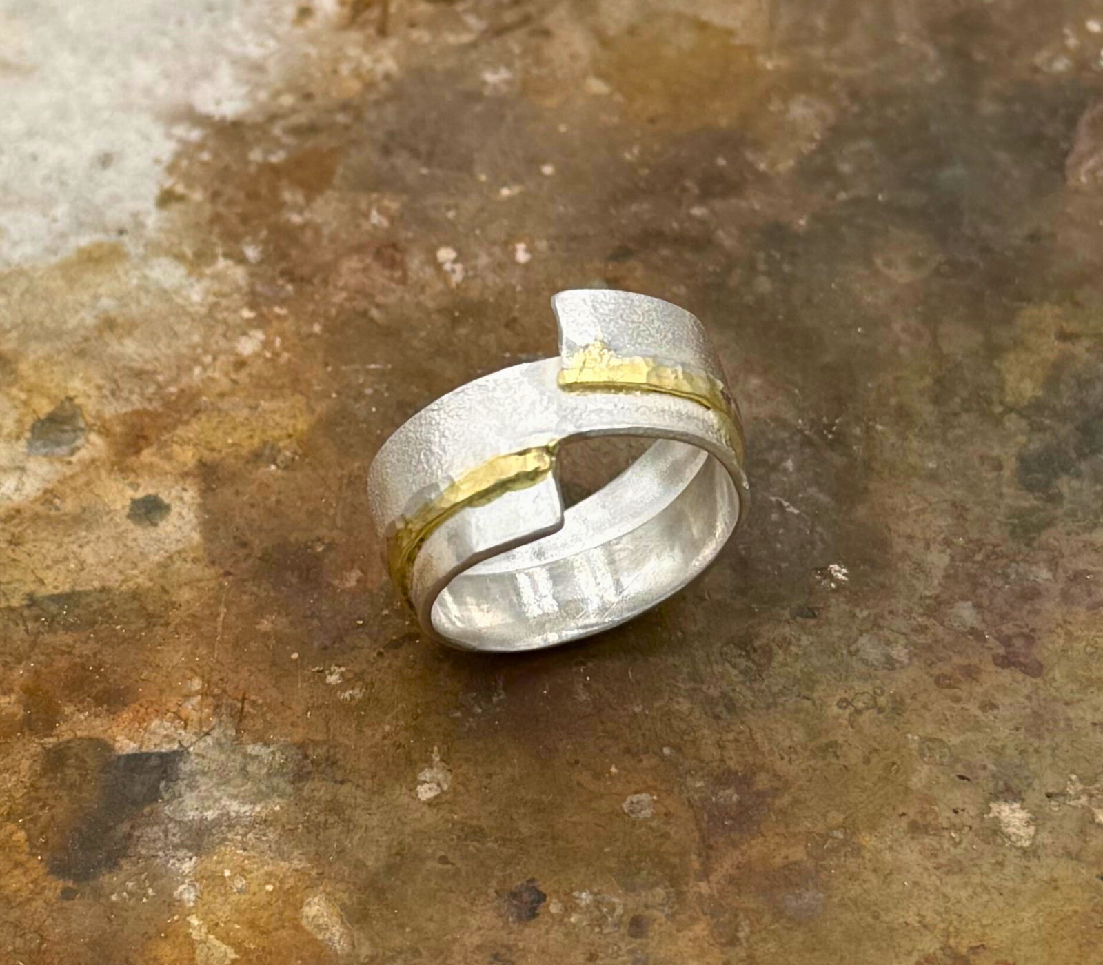 Questo anello in argento 925 e oro 750 è ispirato a Kintsugi: l’antica tecnica giapponese che valorizza le crepe e le fratture degli oggetti in ceramica riparandole con lacca urushi e polvere d'oro.