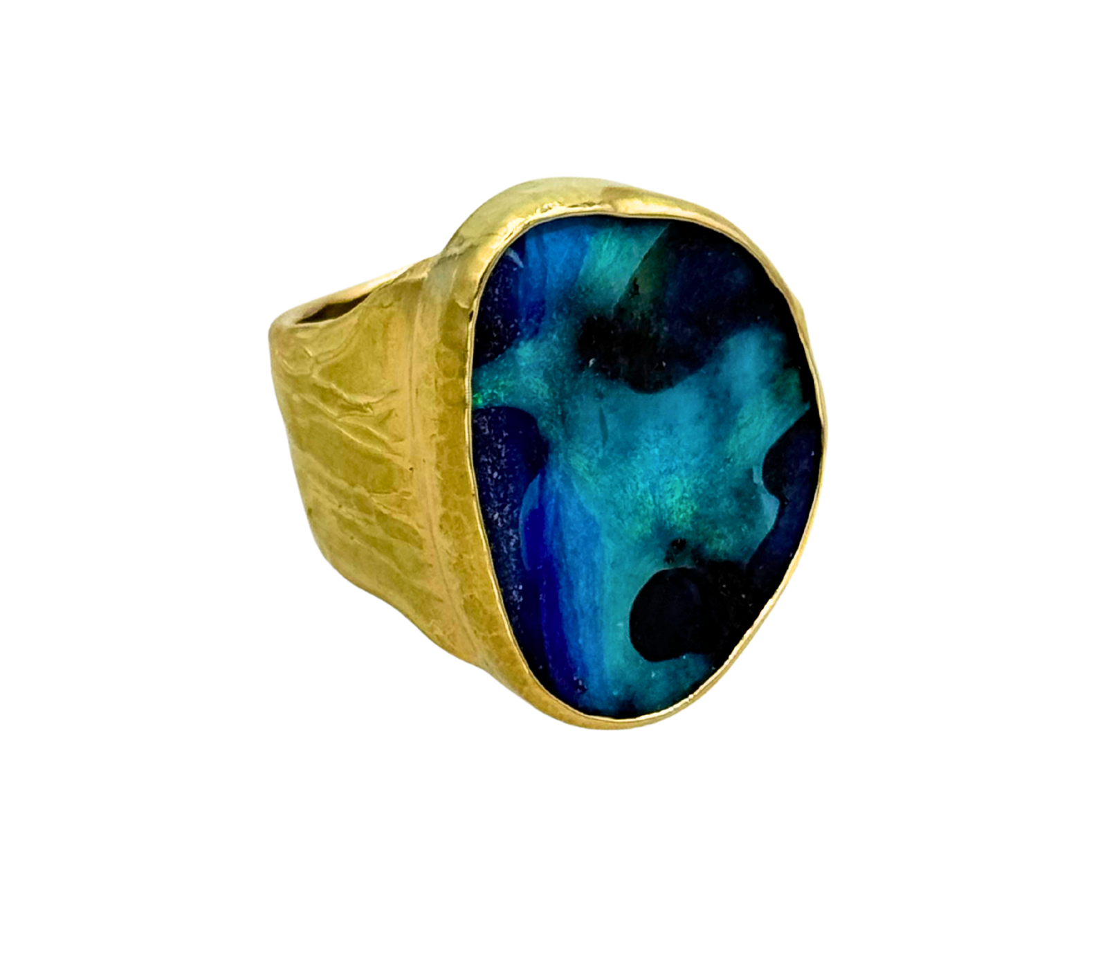 L'opale è stato incorniciato da un filo in oro giallo lavorato a mano a fuoco e martello nel nostro laboratorio orafo di Vicenza e da un gambo importante lavorato interamente a mano secondo l'antica tecnica orafa della cera persa.