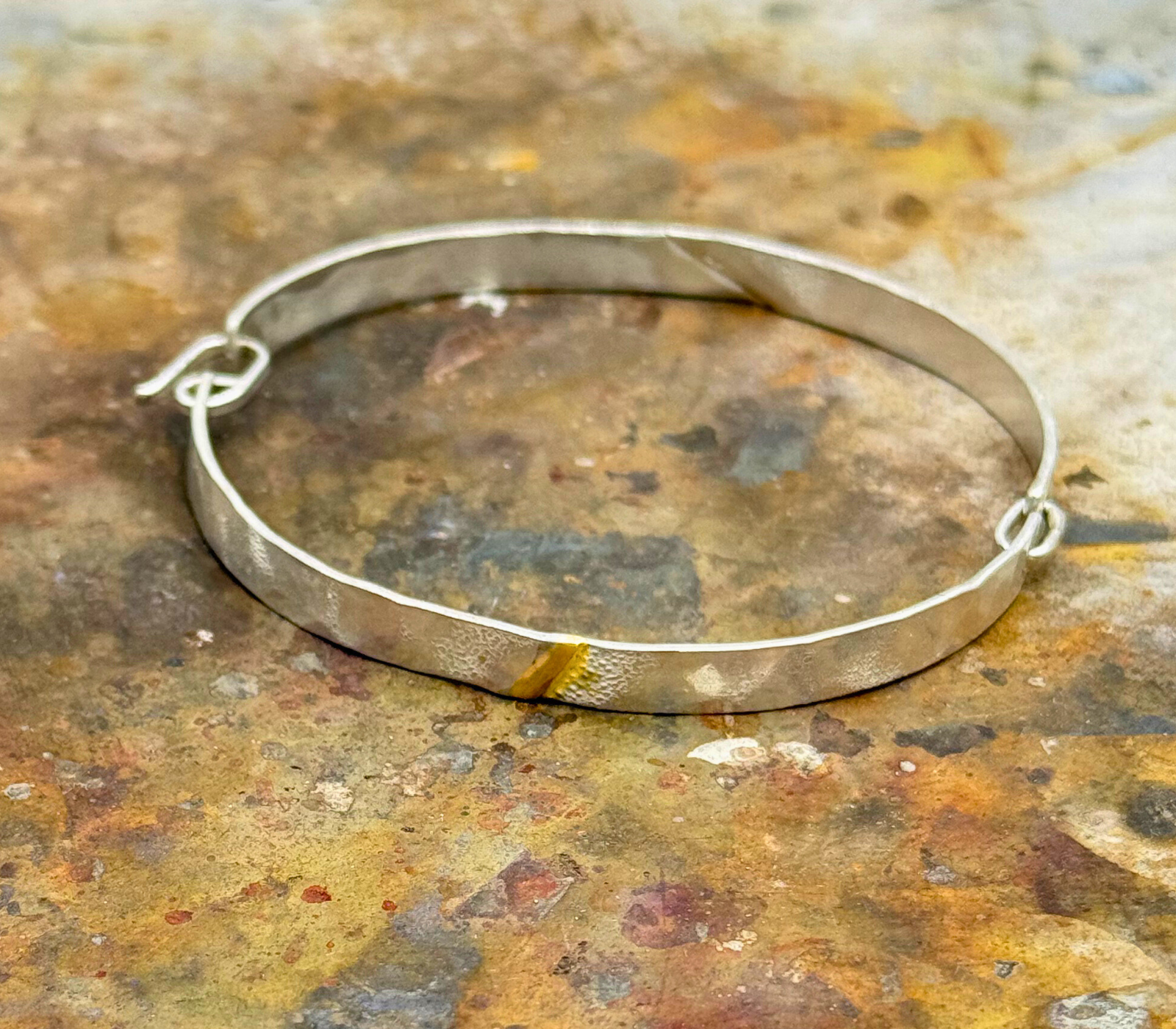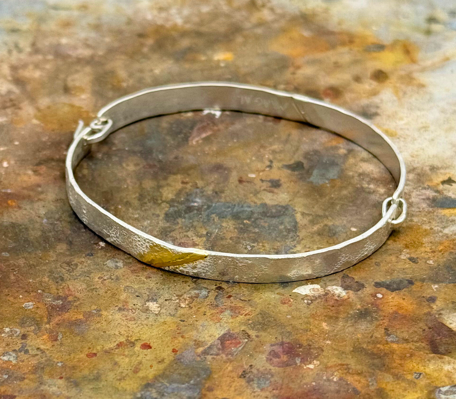 Ogni bracciale è unico e irripetibile perchè la frattura avviene in maniera casuale ed è questo parte della sua bellezza. I materiali utilizzati sono argento 925 e filo d'oro 750.