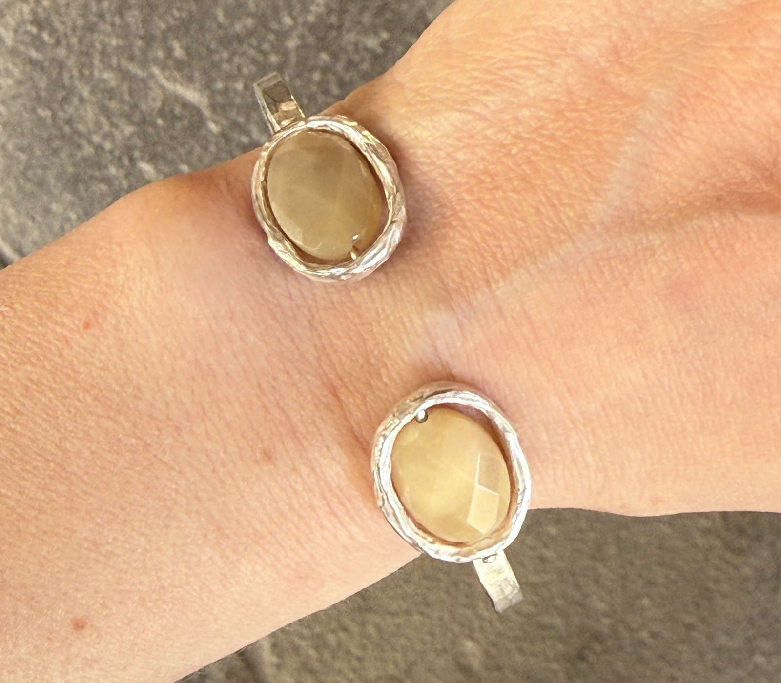 Bracciale in argento 925 battuto a martello con l'inserimento di due opali gialli .