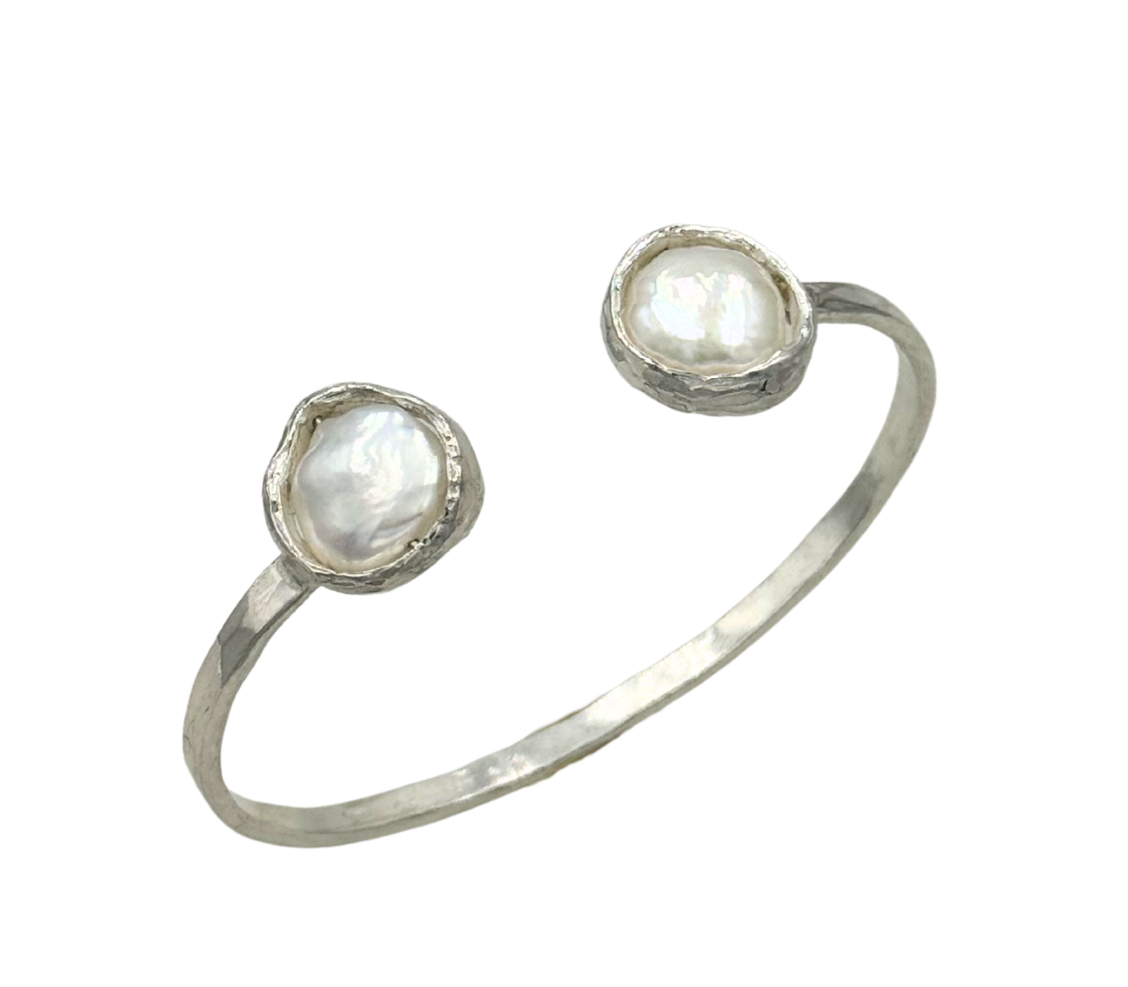 Bracciale in argento 925 battuto a martello con l'inserimento di due perle d'acqua dolce.