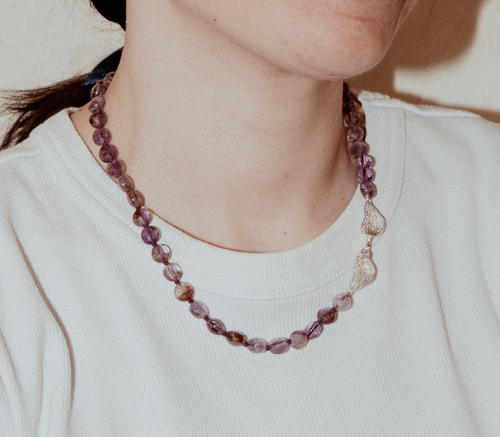 Questa collana è composta da graziose sfere sfaccettate di quarzo ametista phantom e da una chiusura composta di due ali scolpite in argento 925 secondo l'antica tecnica della cera persa da Magal.
