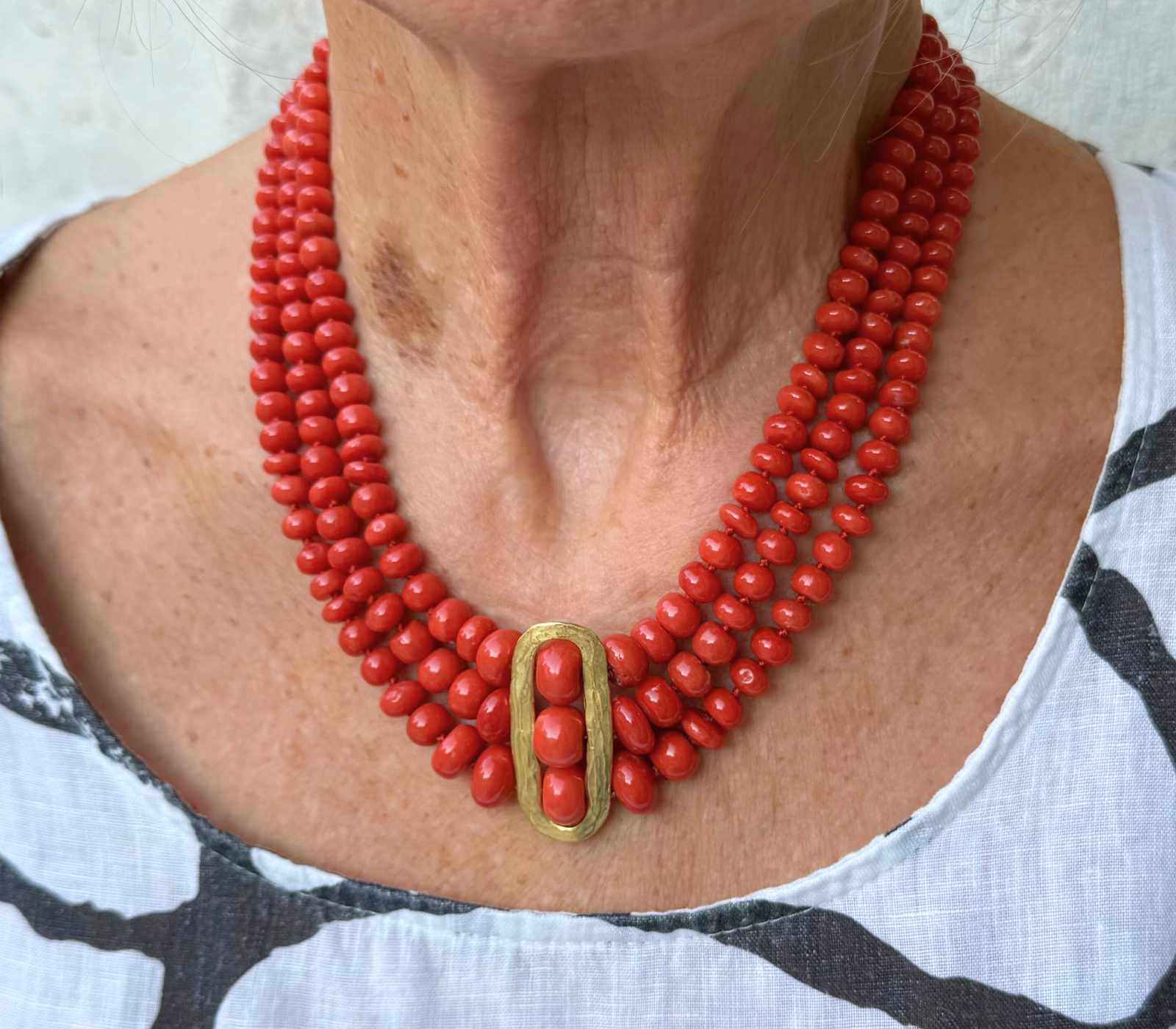 Questo collana in oro giallo 750 e tre fili di corallo rosso mediterraneo è lavorata interamente a mano nel nostro laboratorio orafo di Vicenza secondo l'antica tecnica della cera persa.