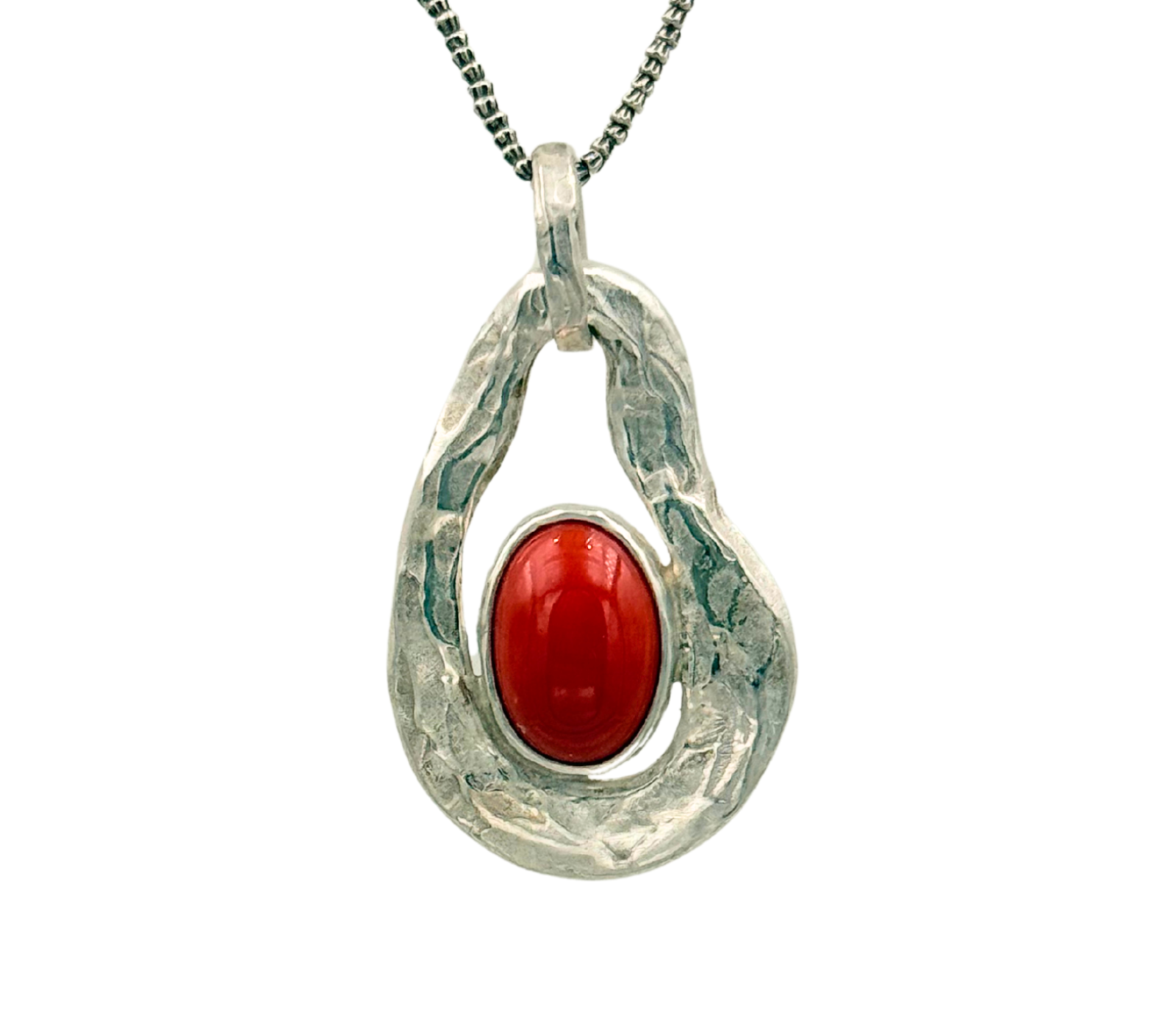 Pendente in argento 925 e corallo mediterraneo, lavorato interamente a mano secondo l'antica tecnica della cera persa.