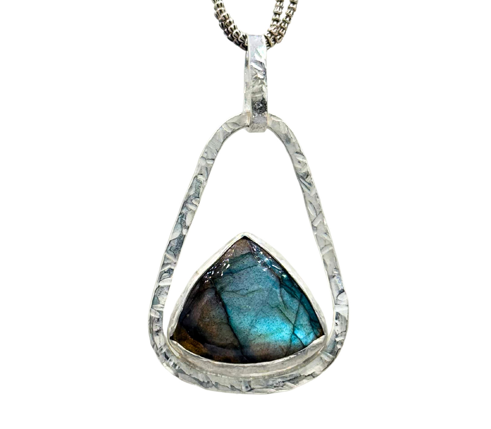 Pendente in argento 925 con labradorite blu a goccia, lavorato interamente a mano a fuoco e martello da Magal nel laboratorio di Vicenza.